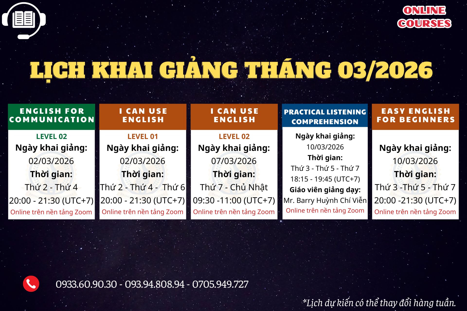 LỊCH DỰ KIẾN KHAI GIẢNG CÁC KHÓA HỌC